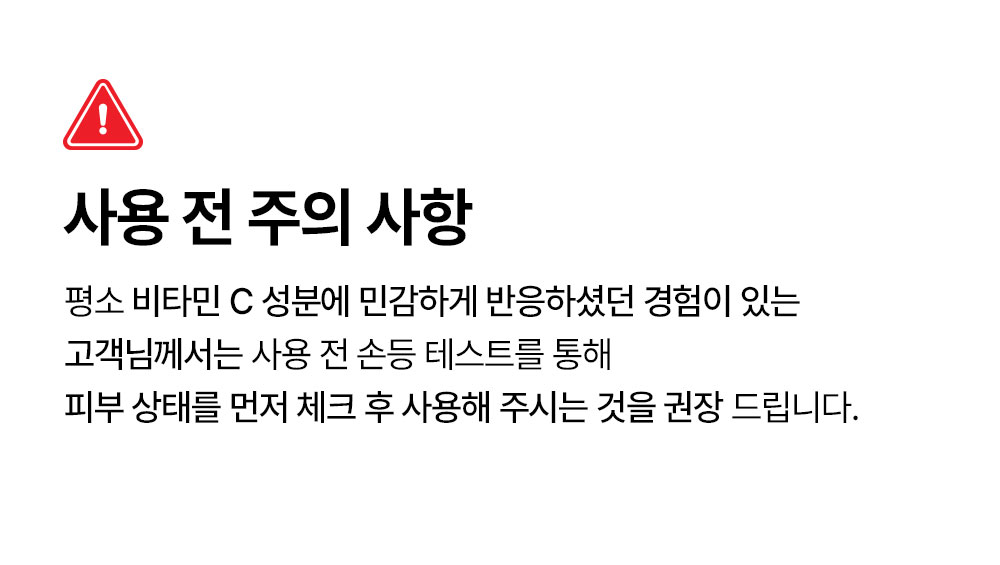 [사용 중 주의사항] | 1. 화장품 사용 시 또는 사용 후 직사광선에 의하여 사용부위가 붉은 반점, 부어오름 또는 가려움증 등의 이상 증상이나 부작용이 있는 경우 전문의 등과 상담할 것 2. 상처가 있는 부위 등에는 사용을 자제할 것 3. 보관 및 취급 시의 주의사항 1) 어린이의 손이 닿지 않는 곳에 보관할 것 2) 직사광선을 피해서 보관할 것 |