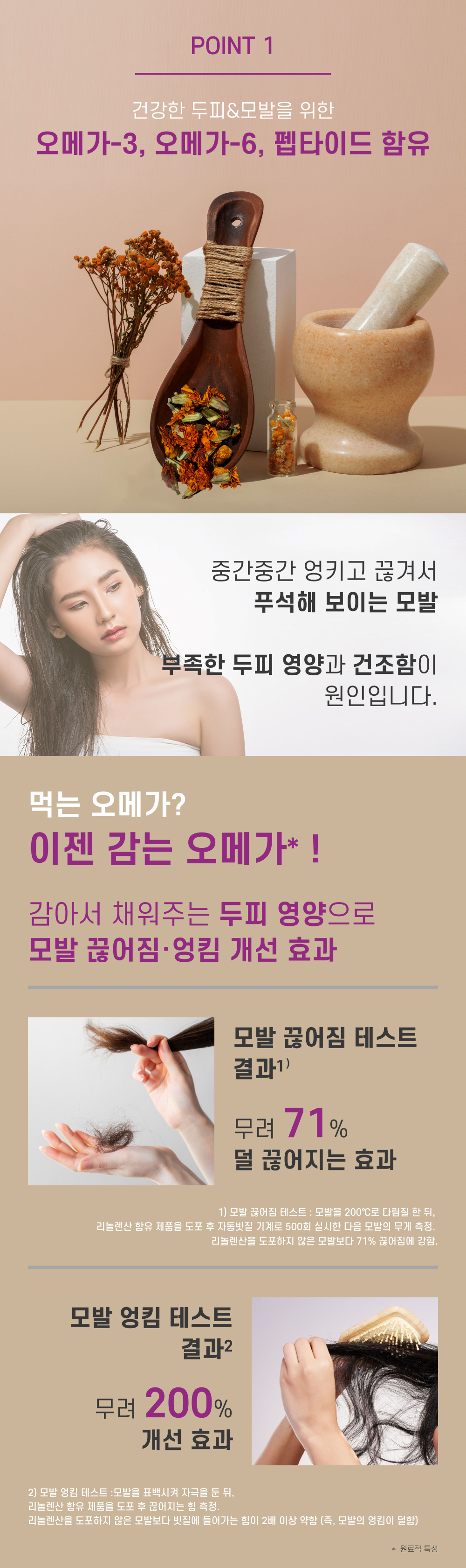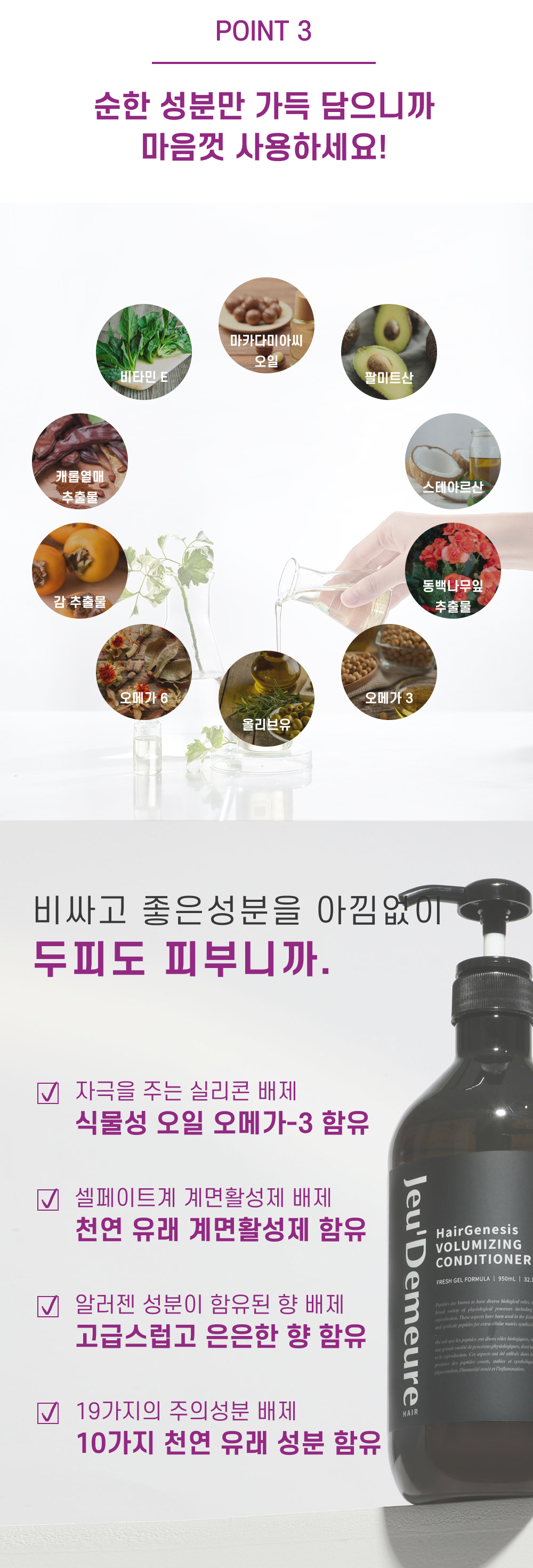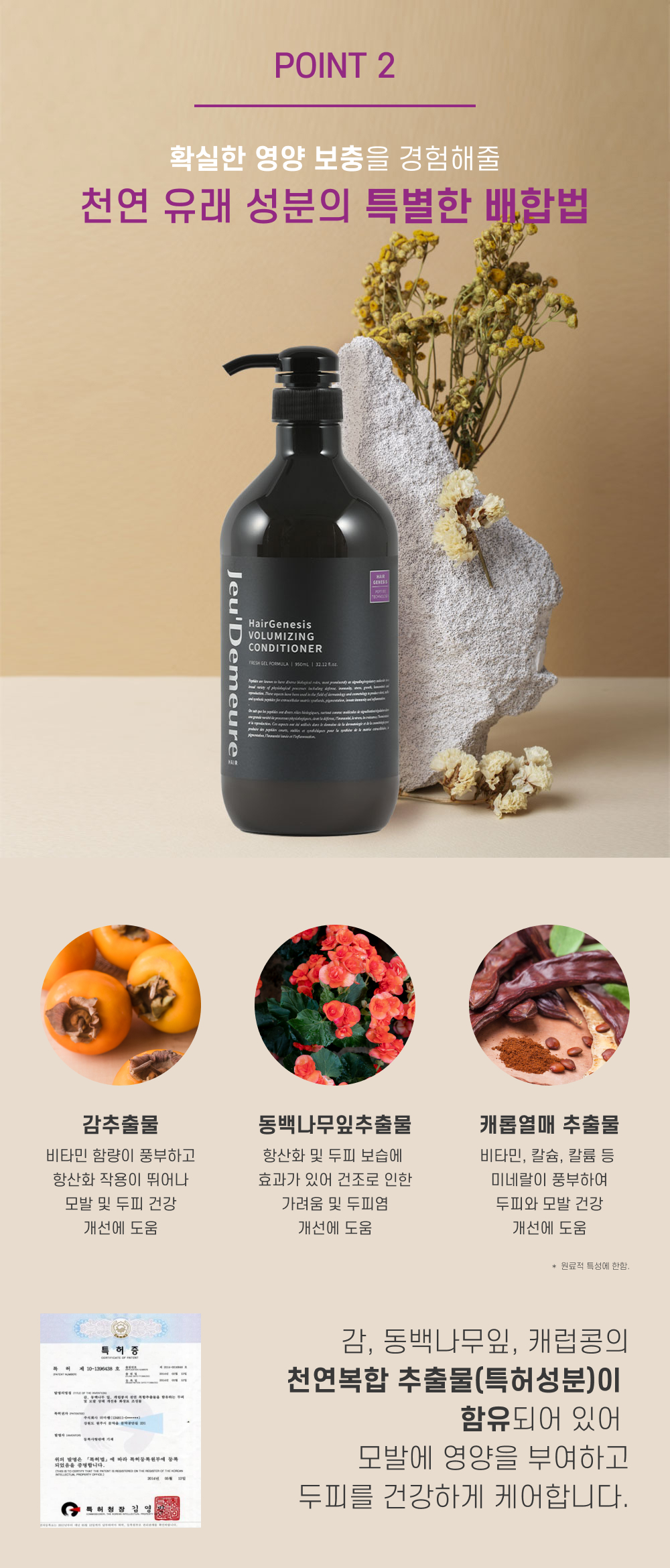 [전성분] | 정제수, 다이메티콘, 마카다미아씨오일, 세테아릴알코올, 베헨트라이모늄클로라이드, 1,2-헥산다이올, 폴리글리세릴스테아레이트, 스테아릴알코올, 아이소프로필알코올, 향료, 알지닌, 에틸헥실글리세릴, 트립토판, 트레오닌, 카퍼트라이펩타이드-1, 알라닌, 카퍼테트라펩타이드-52다이머, 리놀레익애씨드, 부틸렌글라이콜, 올레익애씨드, 팔미틱애씨드, 스테아릭애씨드, 리놀레닉애씨드,캐롭열매추출물, 동백나무잎추출물, 감추출물, 토코페롤 |